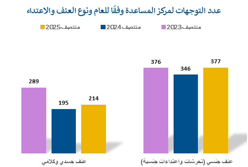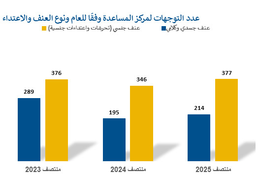 تُظهر البيانات أيضًا انخفاضًا واضحًا في التوجهات إلى مراكز المساعدة منتصف عام 2024، نتيجة الحرب الأخيرة التي قيدت حركة النساء وأضعفت وصولهنّ إلى خدمات الحماية. كما أدّى التدهور الاقتصادي إلى زيادة تبعية النساء للمعيلين، بمن فيهم المعتدون أنفسهم، ما جعل خيار التبليغ محفوفًا بالخوف من فقدان الأمان المعيشي والاجتماعي.