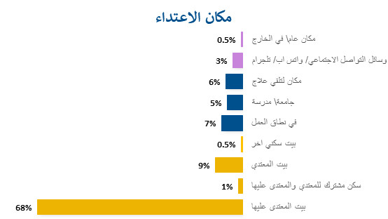 تكشف البيانات أن المنزل، سواء بيت المعتدى عليها أو بيت المعتدي، يشكّل المسرح الأكثر خطورة للعنف ضد النساء، بنسبة 68% لحالات العنف داخل بيت الضحية و9% داخل بيت المعتدي. هذا الواقع الخطير يُظهر أن المكان المفترض أن يكون الأكثر أمانًا يتحوّل إلى فضاء للعنف والتهديد. أما الأماكن الأخرى، مثل مكان العمل (7%) أو الجامعة أو المدرسة (5%)، فتسجّل نسبًا أقل بكثير.